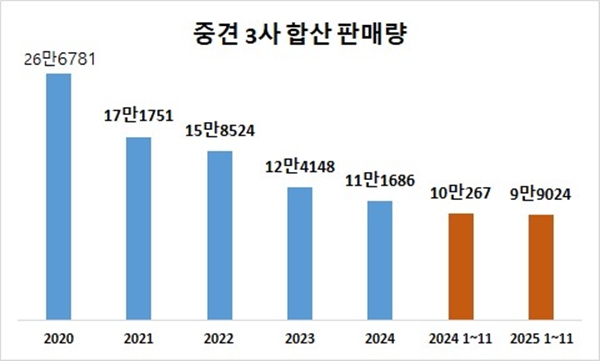 3사의 올해 11월까지 합산 판매량은 9만9024대, 점유율 8%로 역대 최저 수준이다. 올해 국산차 모델별 판매량 1위부터 10위까지는 모두 현대차그룹 모델이다.