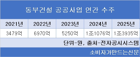 동부건설의 공공공사 수주액은 2021년 3479억 원, 2023년 5250억 원으로 증가세에 있다.