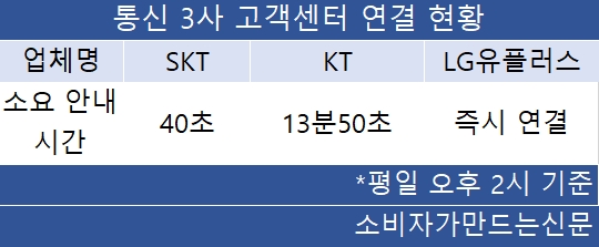8일 오후 2시 기준 소비자가만드는신문이 통신 3사 고객센터에 전화를 걸어 상담사 연결 시간을 확인한 결과 KT에서는 “상담사 연결까지 13분 50초가 소요된다”는 안내가 나왔다. 실제로 통화 연결까지 상당한 대기 시간이 필요했다.