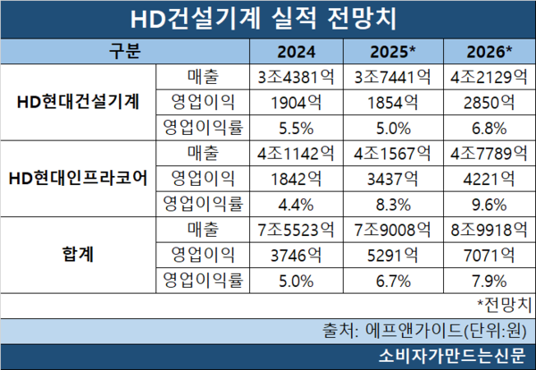 올해는 영업이익률도 7.9%로 1.2%포인트 높아질 전망이다. HD건설기계 실적은 HD현대건설기계와 HD현대인프라코어에 대한 증권가 전망치를 합산했다.