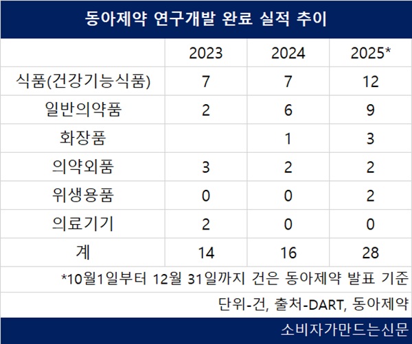 13일 전자공시시스템에 따르면 동아제약의 지난해 신제품 출시는 28건으로 전년 16건에서 크게 늘었다. 아직 사업보고서가 공개되지 않은 4분기 출시 건수는 회사가 밝힌 내용을 토대로 집계했다.