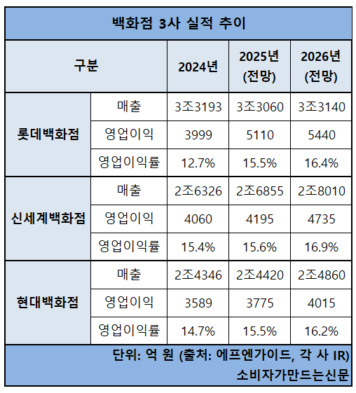 롯데백화점은 수익성 지표에서는 회복세가 두드러진다. 롯데백화점은 지난해 영업이익이 5110억 원으로 27.8% 늘어난 데 이어 올해에도 5440억 원으로 6.5% 증가할 것으로 전망된다.
