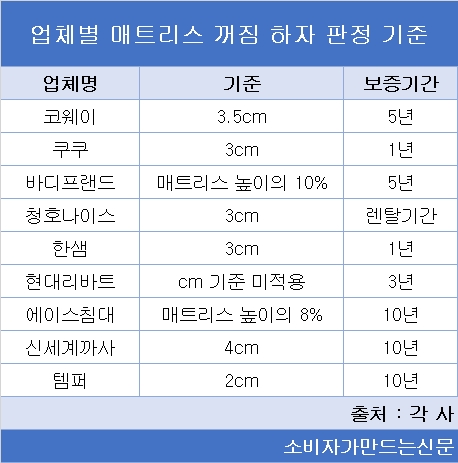 9개 업체 중 ▶쿠쿠·청호나이스·한샘 3개 업체는 3cm 기준을 적용했다. ▶코웨이는 3.5cm ▶신세계까사는 4cm다. ▶템퍼는 2cm가 하자 판정 기준이다. ▶바디프랜드와 ▶에이스침대는 매트리스 높이를 기준으로 각각 10%, 8% 이상 꺼졌을 때 하자로 판단했다. 현대리바트는 종합적으로 하자 여부를 판단해야 해 'cm 기준'은 적용하지 않는다는 입장이다.
