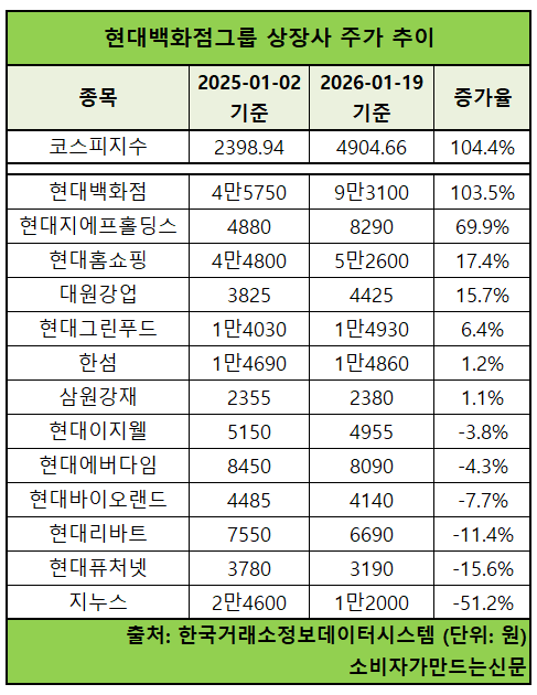 그룹 내 상장사 중에서는 현대백화점만이 4만5750원에서 9만3100원으로 103.5% 오르며 코스피 수익률에 육박했다.