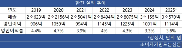 한진은 2019년 12월 노 대표가 부임한 뒤 꾸준히 외형성장을 이뤄왔다. 2019년 당시 2조 원대에 불과했던 매출은 약 1조 원가량 늘어나 2024년에 3조 원대를 넘어섰다.