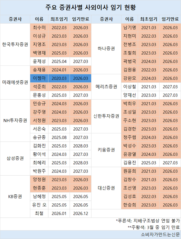 한국투자증권(대표 김성환)은 5명 중 4명, 미래에셋증권(대표 김미섭·허선호)과 키움증권(대표 엄주성)도 4명 중 3명의 임기가 3월 마무리된다.
