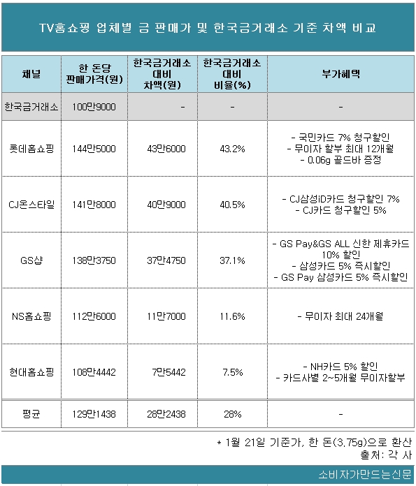 또 다른 홈쇼핑 업체 측은 "홈쇼핑에서 판매되는 금 상품은 국제 금 시세에 단순 연동되는 원자재 개념이 아닌 정품 보증이 포함된 완제품이기에 금 시세 외에도 가공·세공비, 물류·보험, AS 등 소비자 서비스 비용이 반영돼 있다"며 "특히 카드 할인, 적립금, 무이자 할부 등 혜택을 종합적으로 고려하면 고객 입장에서 합리적 선택이라고 할 수 있다"고 설명했다.