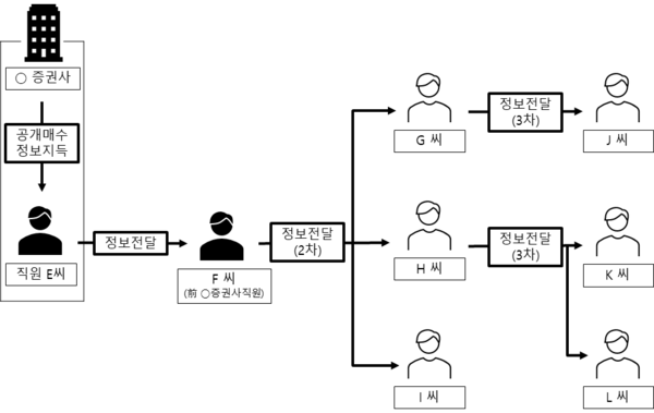이와 함께 G·H·I씨가 F씨로부터 해당 정보를 전달받아 이용하고 J씨는 G씨로부터, K씨와 L씨는 H씨로부터 각각 정보를 전달받아 이용한 점도 확인됐다. 이를 통해 얻은 부당이득은 총 29억 원에 달한다.