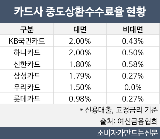 중도상환수수료율이 가장 높은 곳은 KB국민카드와 하나카드 등 2곳으로 대면 기준 수수료율 상한선인 2%를 기록했다.
