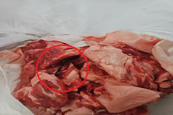 살치살 덩어리를 손질하던 중 고기 사이에서 거머리처럼 보이는 검은색 이물질이 나왔다. 서 씨는 거머리라고 판단해 즉시 매장을 찾아가 문제를 제기했다. 업체 측은 환불해 주면서도 "혈액이 응고된 것"이라고 설명했다.