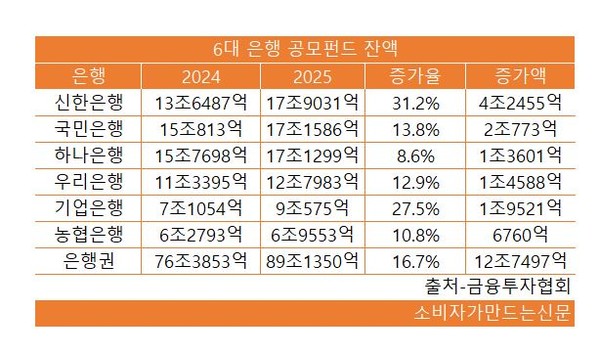 3일 금융투자협회에 따르면 신한은행의 공모펀드 잔고는 2024년 12월 말 기준 13조6487억 원에서 지난해 12월 말 기준 17조9031억 원으로 1년 새 31.2% 증가했다.