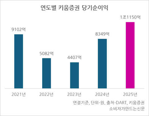 키움증권의 지난해 당기순이익은 연결기준 1조1150억 원으로 전년보다 33.5% 증가했다. 키움증권이 순이익 1조 원을 넘어선 것은 이번이 처음이다.