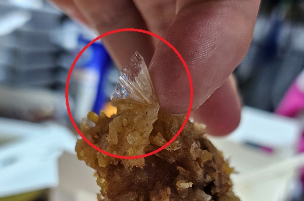 지 씨에 따르면 치킨 조각에 비닐이 붙어 있는 것을 발견하고 처음에는 겉에 묻은 이물질로 생각했다. 그러나 확인 결과 튀김옷에 비닐 조각이 엉킨 채 함께 튀겨진 상태였다.