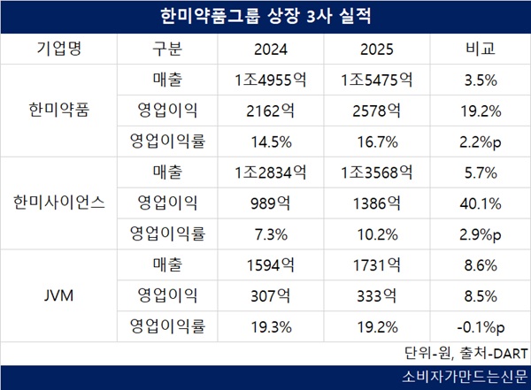 그룹 지주사인 한미사이언스는 매출 1조3568억 원으로 5.7% 증가했다. 영업이익은 1386억 원으로 40.1% 늘면서 영업이익률 10.2%로 2.9%포인트 상승했다.