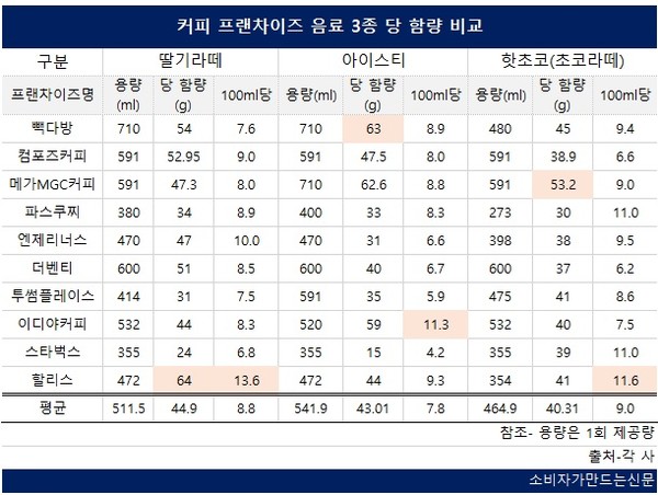 커피 프랜차이즈 음료 제품의 당 함량이 40g 이상으로 세계보건기구가 권고한 일일 섭취량(50g)의 85%에 달해 섭취 시 주의가 필요한 것으로 조사됐다. 아메리카노를 제외한 커피류 제품도 30g을 상회해 권고량의 60%를 웃돌았다.