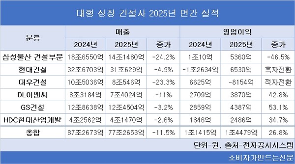 GS건설(대표 허윤홍)과 DL이앤씨(대표 박상신), HDC현대산업개발(대표 정경구·조태제)은 영업이익이 30% 이상 증가한 반면 삼성물산 건설부문(대표 오세철)은 반토막 났다. 현대건설(대표 이한우)은 영업수지가 1조7000억 원가량 개선되며 흑자전환했고, 대우건설(대표 김보현)은 적자전환했다.