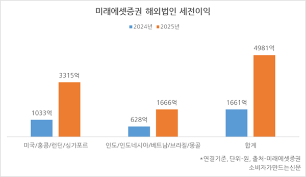 지난해 미래에셋증권 해외법인의 세전이익은 연결기준 4981억 원으로 전년 대비 199.9% 증가해 사상 최대치를 기록했다.