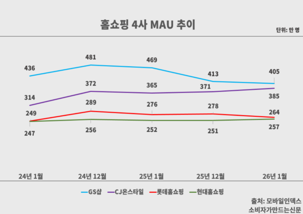 홈쇼핑 '빅4' 중 GS샵은 MAU가 가장 높지만 2년 간 7.1% 감소했다. 롯데홈쇼핑과 현대홈쇼핑은 증가율이 4~6%로 상대적으로 낮다.