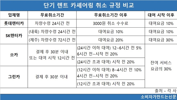 13일 소비자가만드는신문이 △롯데렌터카 △SK렌터카 등 렌터카 업체와 △쏘카 △그린카 등 카셰어링 업체 등 4곳의 취소 규정을 조사한 결과 렌터카 업체들은 무료 취소 기간을 차량 수령 24시간 이전까지로 정해 비교적 소비자 친화적인 것으로 분석됐다.