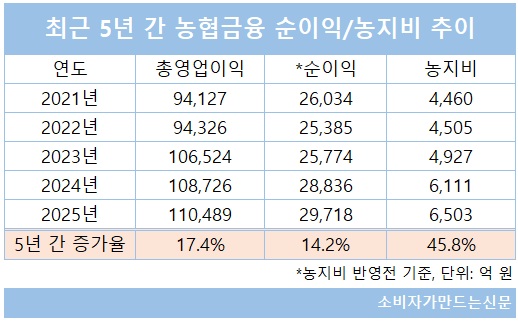 실제로 지난 2021년 기준 농협금융의 농지비 반영전 순이익은 2조6034억 원, 농지비는 4460억 원이었는데 5년이 지난 2025년 기준 순이익은 2조9718억 원, 농지비는 6503억 원이었다. 같은 기간 순이익은 14.2% 증가했지만 농지비는 무려 45.8%나 급증했다. 증가폭으로도 같은 기간 순이익이 3684억 원 늘어날 동안 농지비도 2043억 원이나 증가했다.