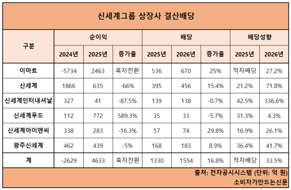 25일 전자공시시스템에 따르면 신세계그룹 상장사 6곳의 2025년도 배당액은 1554억 원으로 전년 대비 16.8% 증가했다. 지난해 신세계 상장사들의 순이익은 4633억 원으로 전년 -2629억 원 대비 영업수지가 7000억 원 이상 개선됐다.