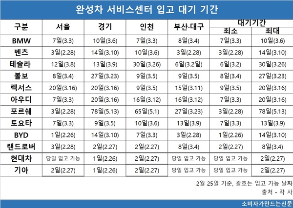 반면 현대자동차와 기아 등 국산차 브랜드의 서비스센터 입고 대기 기간은 최대 2일 수준에 그쳐 수입차와 뚜렷한 차이를 보였다.