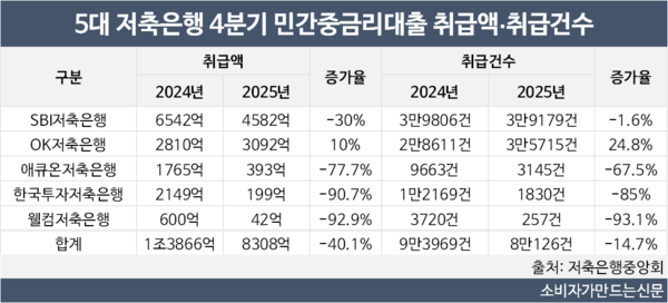 저축은행 5곳 중 OK저축은행을 제외한 4곳이 일제히 대출 취급액이 대폭 줄었다.