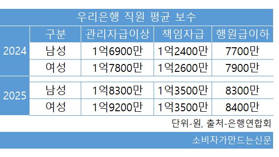우리은행 관계자는 “창구 직원이 대부분 여성인데 정규직이라 평균 보수가 상승한 것으로 보인다”고 말했다.