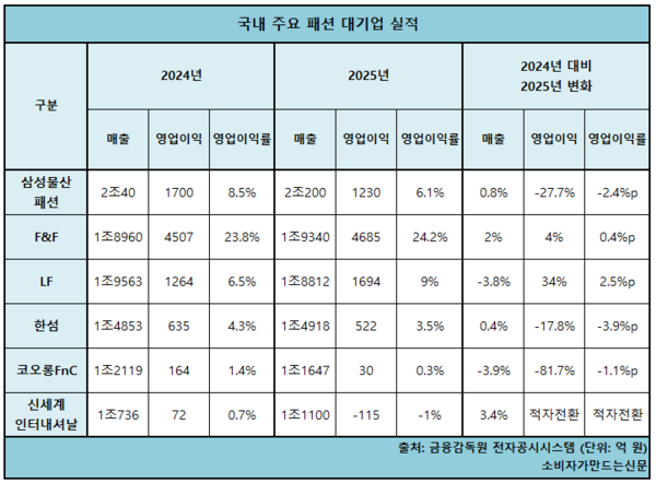 삼성물산 패션부문(부문장 이준서), 한섬(대표 김민덕), 코오롱FnC(대표 유석진), 신세계인터내셔날(대표 김덕주) 등 주요 대형사들은 수익성 둔화를 겪은 반면, 중국 등 글로벌 시장 확장에 성공한 F&F(대표 김창수)와 사업 포트폴리오 다변화 성과를 낸 LF(대표 오규식)는 견조한 실적을 기록했다.