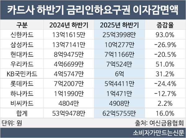 이자감면액도 카드사 중에서 신한카드가 압도적으로 많았다. 신한카드의 이자감면액은 25억3998만 원으로 전년 동기 대비 12억2383만 원 증가했다.