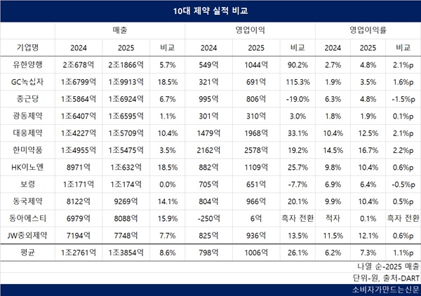 유한·대웅·한미·이노엔·동국, 지난해 역대 최대 실적...10대 제약사 평균 1000억 원대 영업익