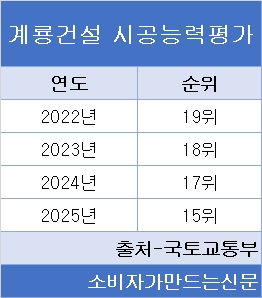 시공능력평가 순위도 상승 흐름을 보이고 있다. 2023년 17위, 2024년 17위, 2025년 15위를 기록하며 지난해 창사 이후 최고 순위를 기록했다.