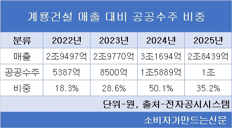 매출 대비 공공수주 비중도 이승찬 회장 취임 이후 크게 확대됐다. 취임전인 2022년 계룡건설은 매출 2조9497억 원 대비 공공수주 5387억 원으로 약 18% 수준이었지만 취임 이후인 2023년에는 약 29%로 상승했다. 2024년에는 50% 수준까지 확대됐다.