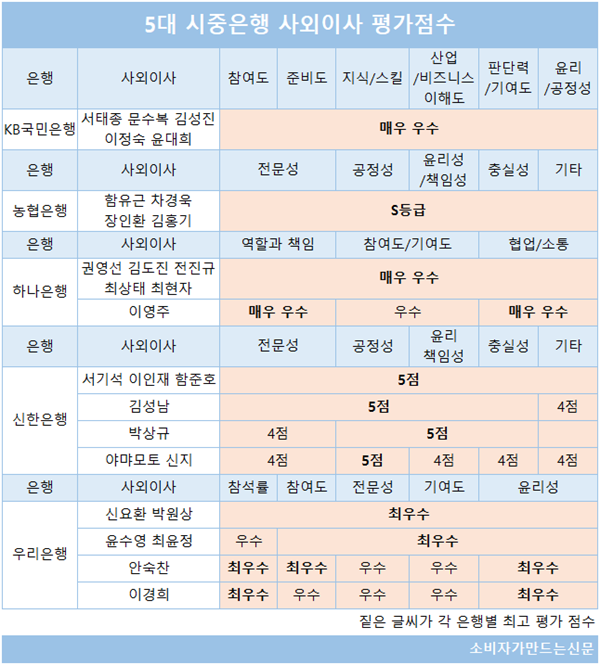 16일 각 사 지배구조 및 보수체계 연차보고서에 따르면 국민은행, 신한은행, 하나은행, 우리은행, 농협은행 등 5대 시중은행이 지난해 사외이사 전원에게 '우수' 이상의 높은 점수를 매겼다.