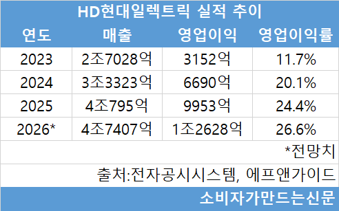 HD현대일렉트릭은 전력기기 슈퍼사이클에 힘입어 실적이 가파르게 성장하고 있다. 지난 2023년 2조7028억 원이던 매출은 지난해 4조795억 원으로 50.9% 증가했다. 영업이익도 2023년 3152억 원에서 2025년 9953억 원으로 215.8% 늘었다.