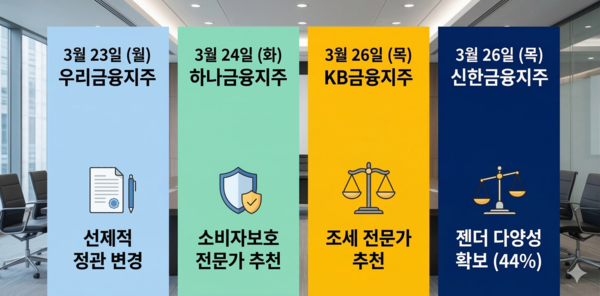 오는 23일 우리금융지주(회장 임종룡)을 시작으로 24일 하나금융지주(회장 함영주), 26일 KB금융지주(회장 양종희)와 신한금융지주(회장 진옥동) 주총이 열린다.