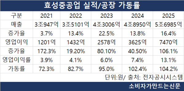 16일 전자공시시스템에 따르면 효성중공업의 지난해 공장 가동률은 104.2%다. 2024년 102.4%에 이어 2년 연속 100% 이상을 기록했다.