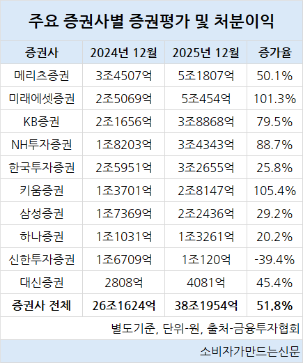 이외에 NH투자증권(대표 윤병운)은 88.7% 증가한 3조4343억 원, 한국투자증권(대표 김성환)은 25.8% 증가한 3조2655억 원을 기록했다.