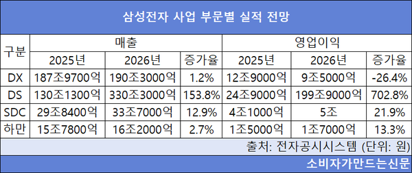 반면 DX는 정반대의 상황이다. 메모리값 상승세가 유발한 칩플레이션이 원재료 수급 부담으로 이어질 것이라는 전망이다. 시장에서는 매출액은 지난해 수준을 간신히 유지하겠지만 영업이익은 40% 가까이 축소될 것으로 보고 있다. 삼성전자가 지난달 출시한 '갤럭시 S26' 시리즈 최상위 모델인 울트라의 가격을 최대 29만5000만 원 올린 것도 칩 가격 상승에 따른 고육책이다.