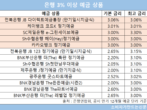 우대금리 포함 기준으로는 SC제일은행 'e-그린세이브예금'이 연 3.30%로 가장 높았고 수협은행 'Sh첫만남우대예금'과 제주은행 'J정기예금(만기지급식)'이 연 3.10%로 뒤를 이었다. 기본금리 기준으로는 전북은행 'JB다이렉트예금통장(만기일시지급식)'이 연 3.06%로 가장 높았다.