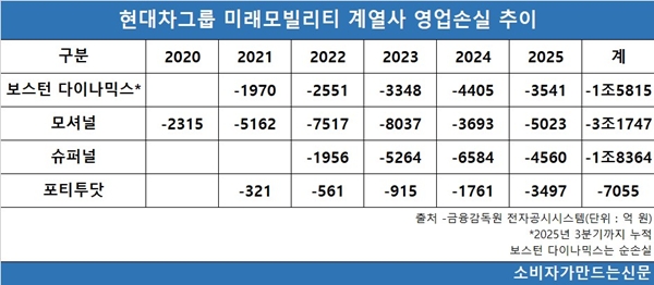 이어 슈퍼널 1조8364억, 포티투닷 7055억 원의 영업손실을 기록하고 있다. 보스턴다이나믹스는 지난 5년간 1조5815억 원의 순손실을 기록했다.