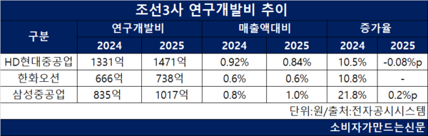 R&D 투자액은 HD현대중공업(대표 이상균·노진율)이 1471억 원으로 가장 많고 R&D 투자액 증가율은 삼성중공업(대표 최성안)이 20% 이상으로 가장 높다.