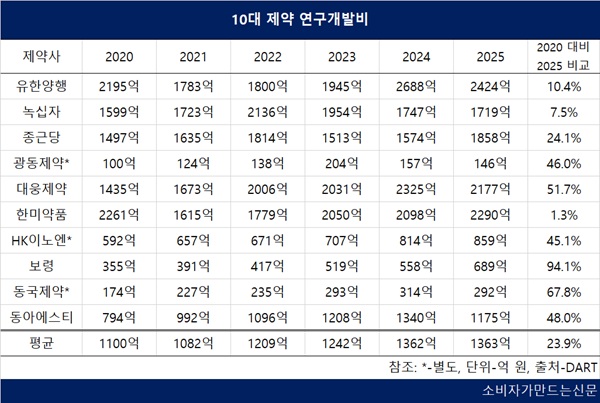 25일 전자공시시스템에 따르면 10대 제약사의 지난해 R&D 투자액은 평균 1363억 원으로 조사됐다. 2020년부터 살펴보면 2021년만 줄었고 나머지 해는 소폭이지만 매년 증가했다.