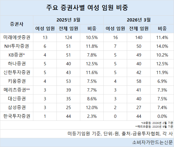 25일 소비자가만드는신문이 자기자본 기준 10대 증권사의 임원 현황을 조사한 결과 미래에셋증권은 올해 3월 기준 여성 임원(사외이사 제외)이 16명으로 1년 전보다 3명 늘어난 것으로 나타났다.