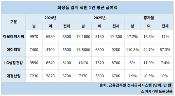 특히 남자 직원 평균 급여는 1억5600만 원으로 전년 대비 두 배 이상 늘었다. 화장품 업계 주요 기업들 중에서도 가장 높다. 여자 직원은 증가폭이 44.7%로 상대적으로 낮다.