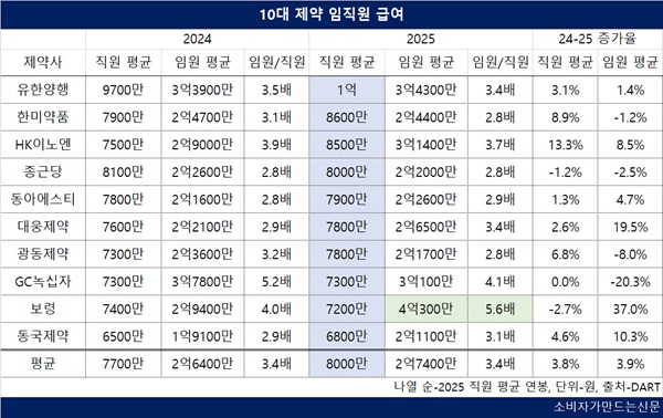 25일 전자공시시스템에 따르면 10대 제약사의 지난해 직원 평균 연봉은 8000만 원으로 전년 대비 3.8% 증가했다.