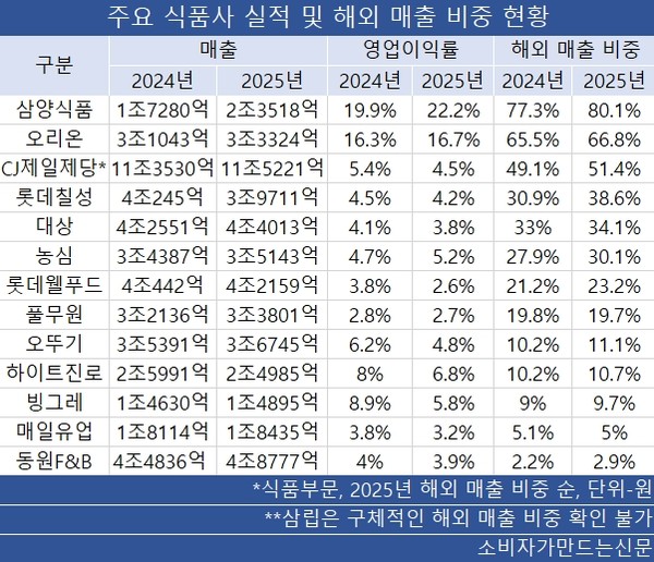 매출 1조 원 이상 식품사 중 지난해 해외 매출 비중이 가장 높은 곳은 삼양식품(대표 김정수·김동찬)으로 80% 이상을 해외에서 벌었다. 삼양식품의 영업이익률은 이들 식품사 중 유일하게 22% 이상을 기록했다. 해외 매출 비중이 67%인 오리온(대표 이승준) 역시 영업이익률이 16.7%에 달한다.