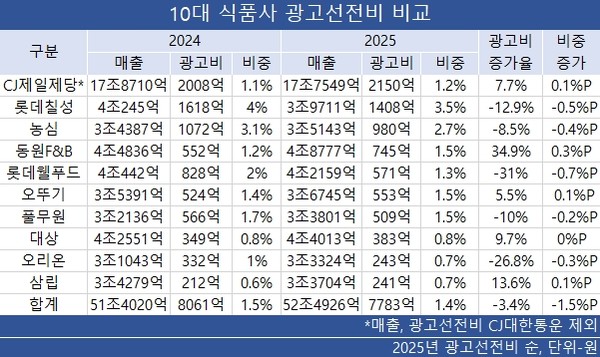 광고비는 CJ제일제당이 2150억 원으로 가장 많다. 롯데칠성은 1408억 원으로 두 번째다. 이어 농심 980억 원, 동원F&B 745억 원 등의 순이다.