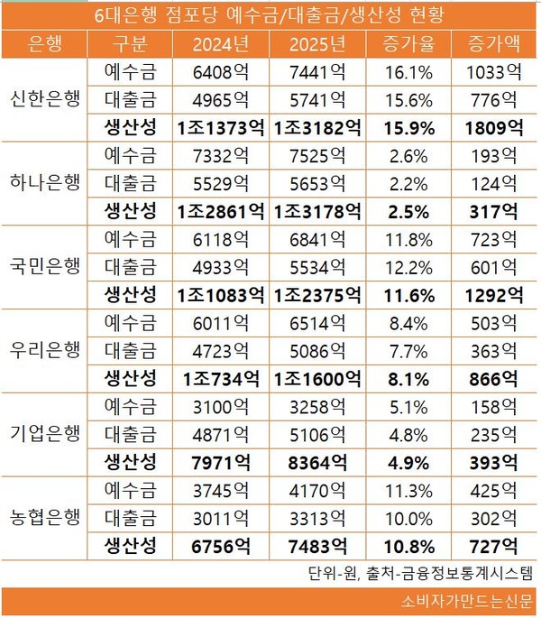 6대 은행 중에서 신한은행(행장 정상혁)의 점포당 생산성이 가장 높았고 생산성 상승폭도 가장 높았다. 하나은행(행장 이호성)과 농협은행(행장 강태영)은 점포를 늘렸음에도 생산성은 소폭 개선됐다. 하나은행은 2024년 생산성 1위에서 2위로 밀렸다.