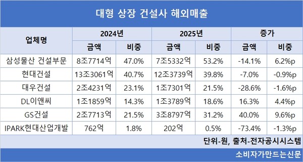 GS건설은 해외매출이 전년 대비 40% 증가하고 비중도 9.6%포인트 상승했다. DL이앤씨(대표 박상신) 역시 비중이 4.4%포인트 올랐다.
